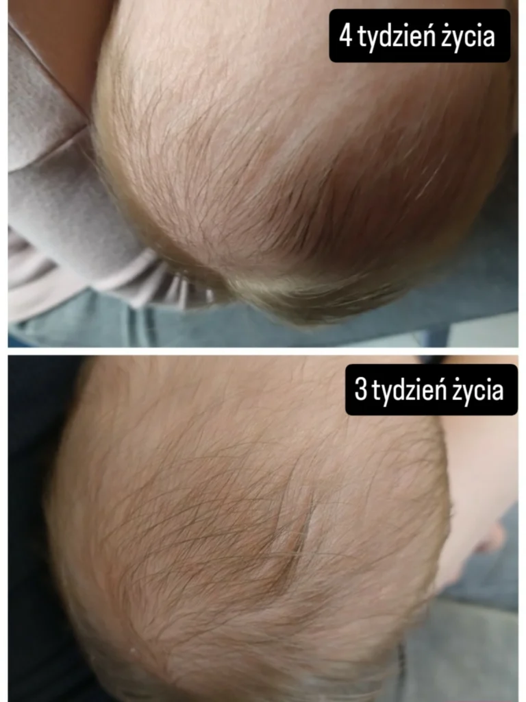 Na powyższych zdjęciach możecie zobaczyć efekt terapii strukturalnej: różnica pomiędzy 3. a 4. tygodniem życia u maluszka jest wyraźna – czaszka staje się bardziej symetryczna, a linie napięcia mięśniowego ulegają normalizacji.